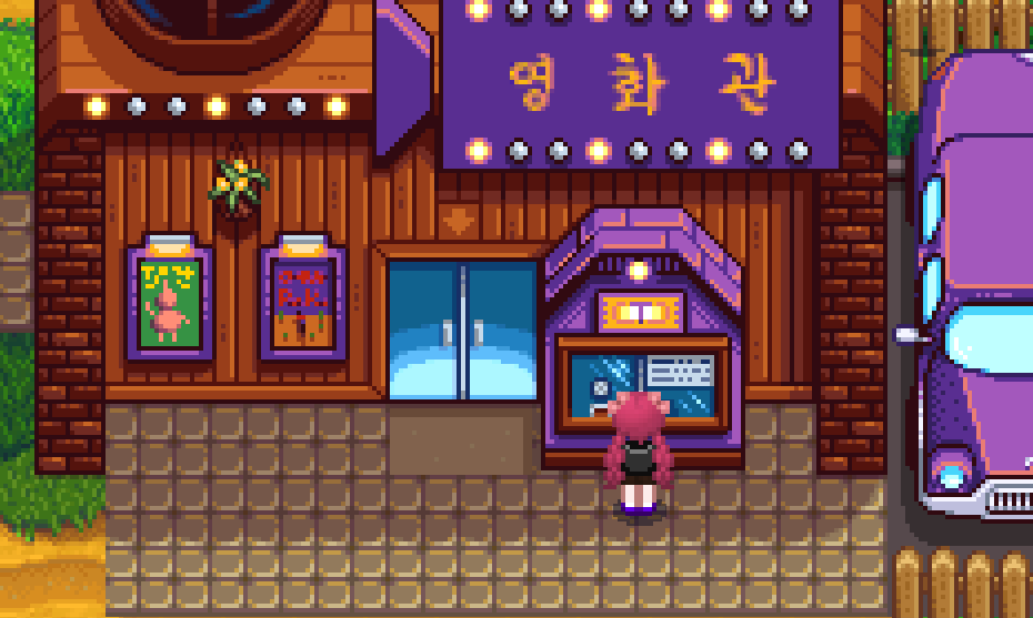 다음 날이 되면, 영화관이 새로 생겼습니다. 입구에서 영화표를 1000골드에 구매할 수 있습니다.
