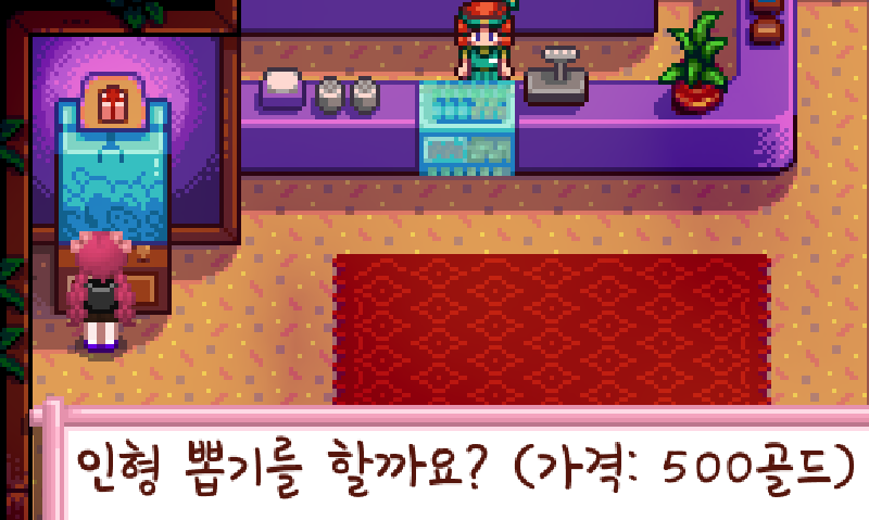 왼쪽 인형뽑기 기계에서는 500골드로 인형뽑기를 할 수 있습니다.(사람이 있는 경우 불가합니다)