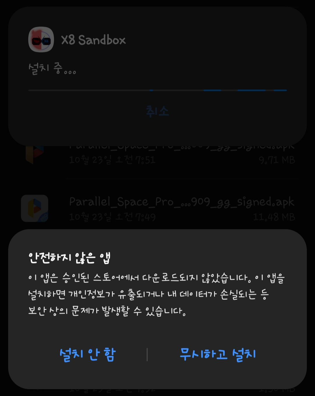 안드로이드 VM인 X8 Sandbox를 설치해 주세요. 이 프로그램은 루팅된 환경 위에 게임해킹 툴을 실행할 수 있게 해주는 프로그램입니다. 폰 안에 가상의 안드로이드 환경을 만들어 주는 거에요.