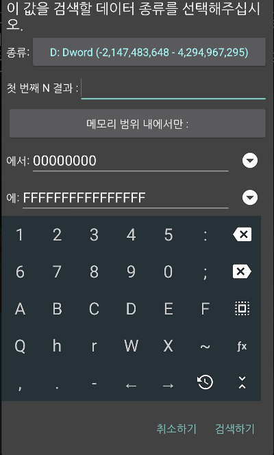 값에는 변경할 수치의 값을, 종류는 A를 선택한 후 새로운 검색을 눌러주세요. 혹시 값이 검색이 안 될 경우엔 값이 암호화되어 있습니다 에 체크해 주시면 됩니다.