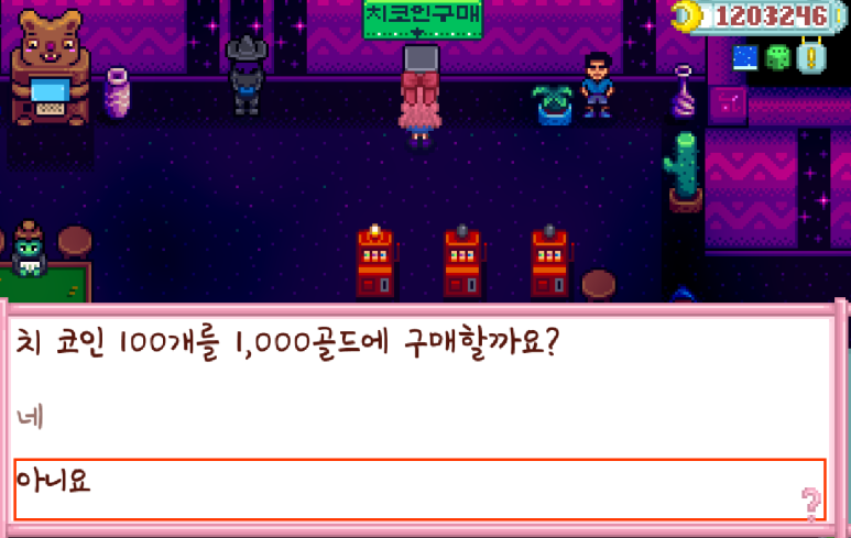 기계에서는 치코인을 구매할 수 있습니다. 100개에 1000골드이며 치코인이 있어야 게임이 가능합니다.