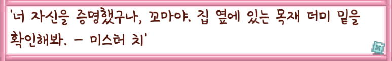 집 옆의 목재더미를 조사하라고 합니다. 집으로 돌아갑니다.