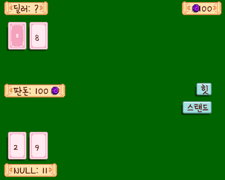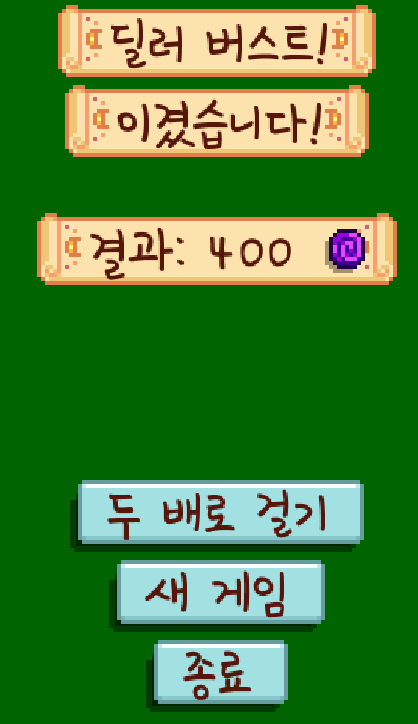이렇게 카드의 합이 21에 가까워지면 스탠드로 종료를 한 후 결과를 확인합니다.