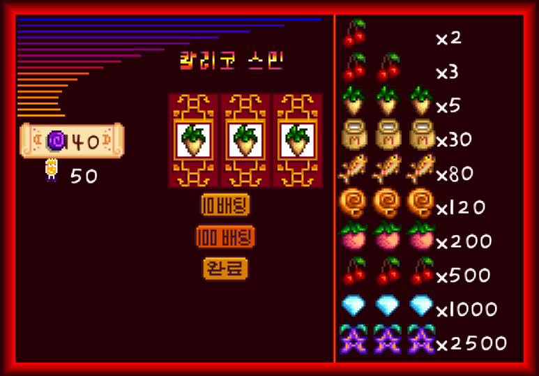 오른쪽의 리스트에 해당하는 슬롯이면 해당 배수의 코인을 줍니다.
