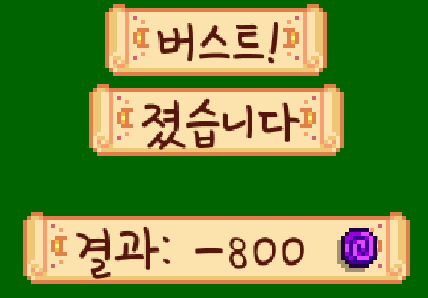 기본 배팅금액은 100코인이고, 승리할 경우 두배로 걸 수 있습니다. 저는 2번 두배로 걸어서 400코인이네요.