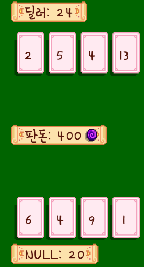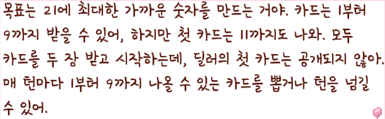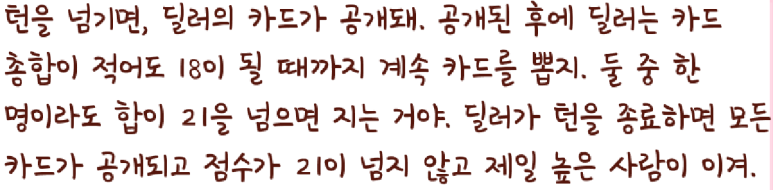 칼리코잭의 룰입니다. 21에 제일 가까우면서 숫자가 높으면 이기는 게임입니다.